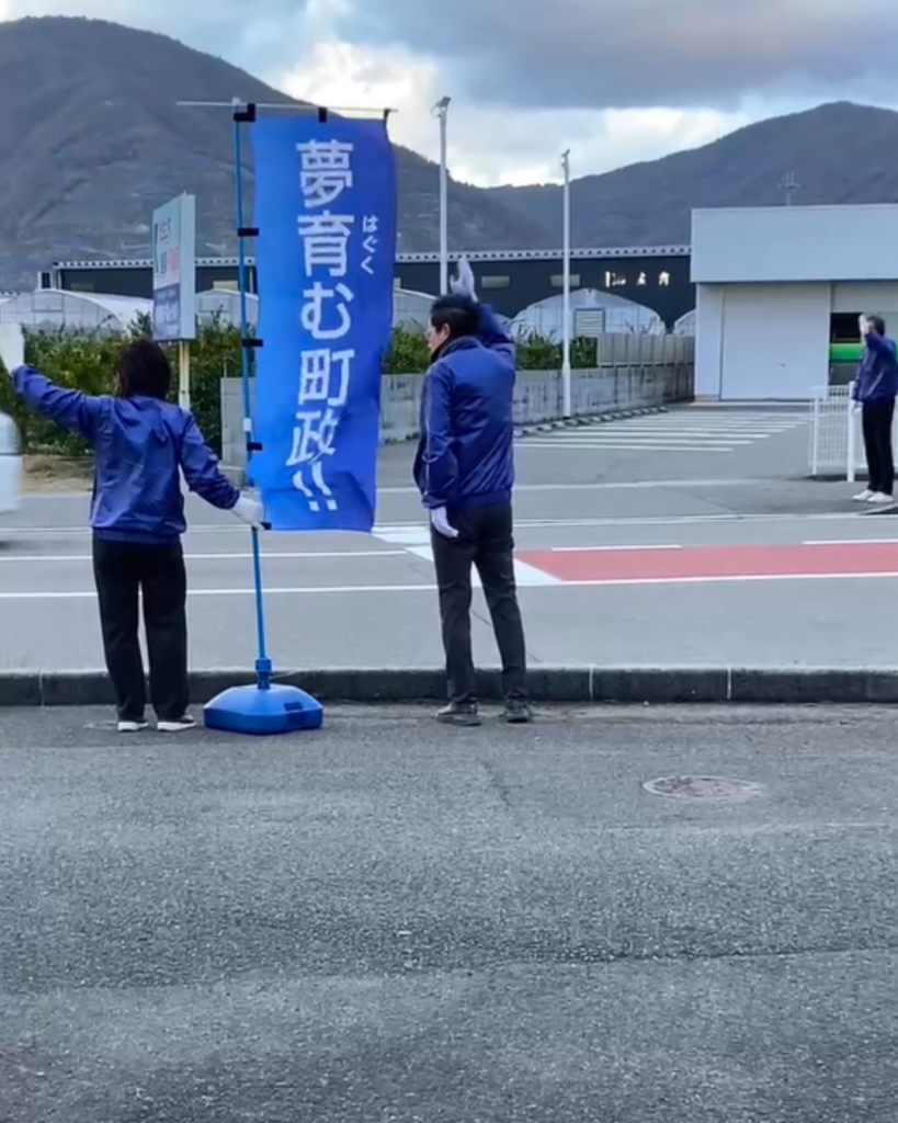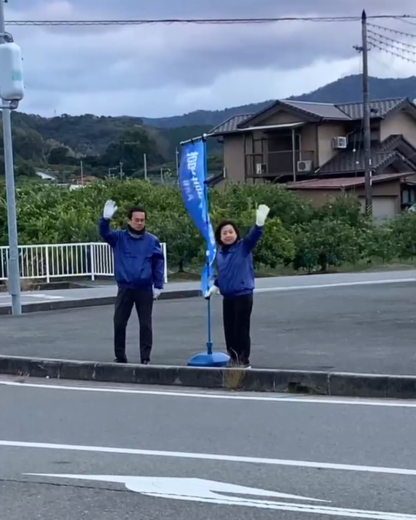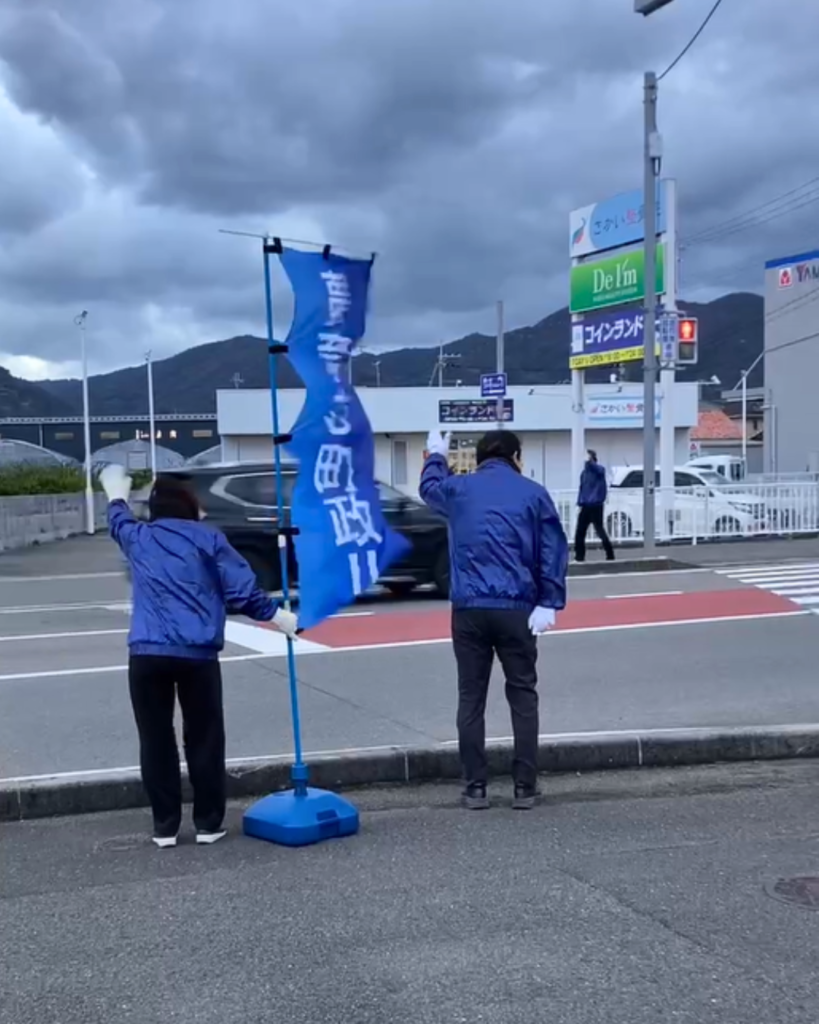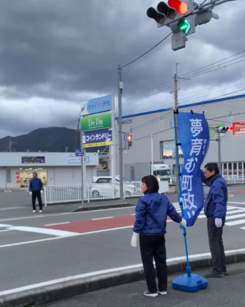 信号機も揺れるほどの強い風が吹き、厳しい寒さの中での活動となりましたが、後援会会長も一緒に立ち、心強く一日をスタートすることができました。